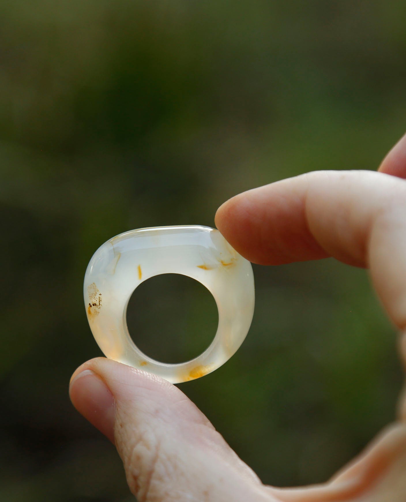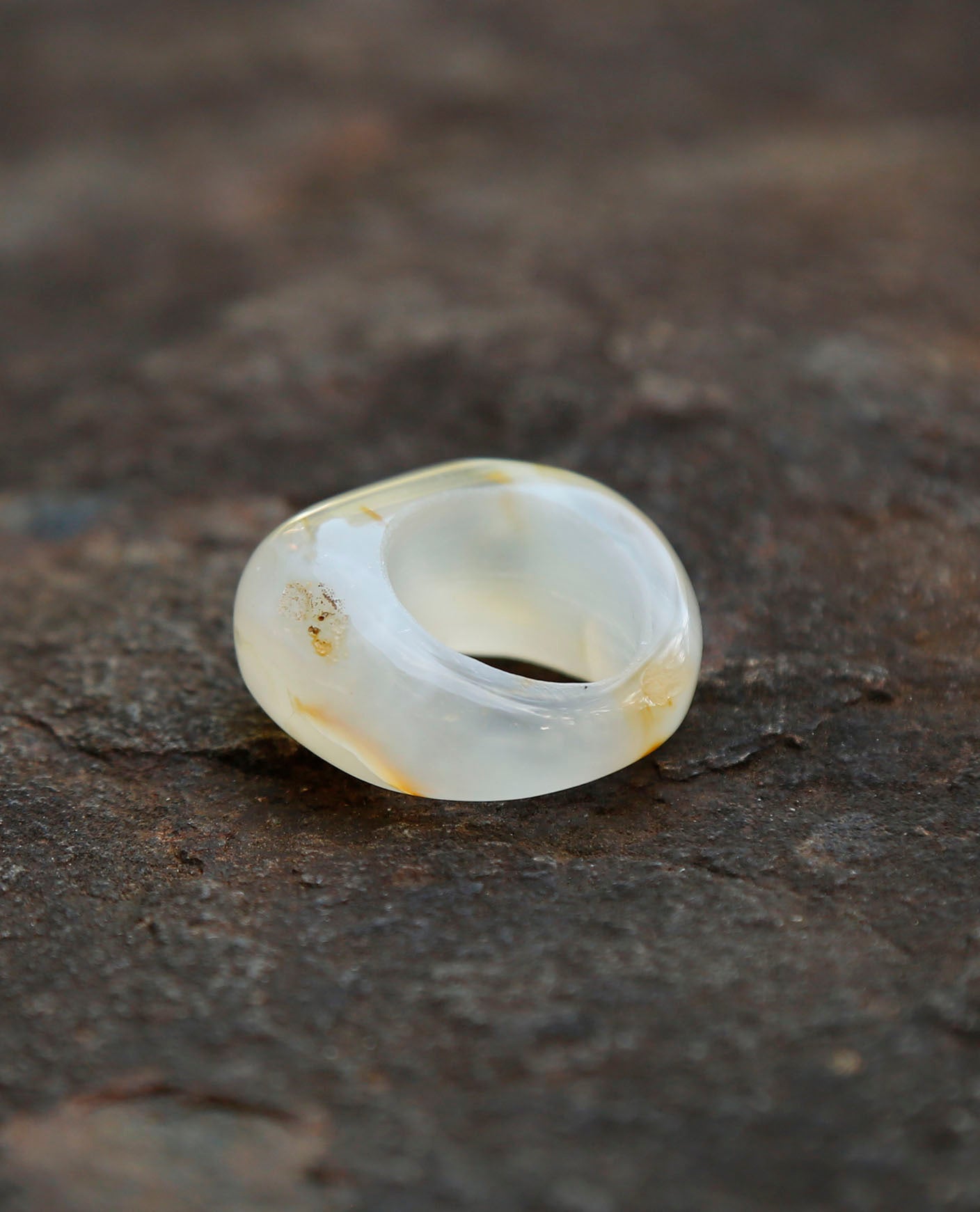 The ring was cut, drilled, shaped and polished from a single piece of agate using traditional lapidary techniques, carefully revealing the natural structure and translucency of the stone.